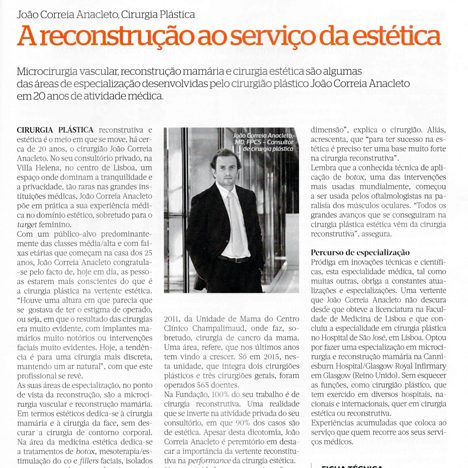 Cirurgia plástica reconstrutiva e estética é o meio em que se move, há cerca de 20 anos, o cirurgião João Correia Anacleto. No seu consultório privado, na Villa Helena no centro de Lisboa, um espaço onde dominam a tranquilidade e a privacidade, tão raras nas grandes instituições médicas, João Correia Anacleto põe em prática a sua experiência médica no domínio estético, sobretudo para o target feminino.