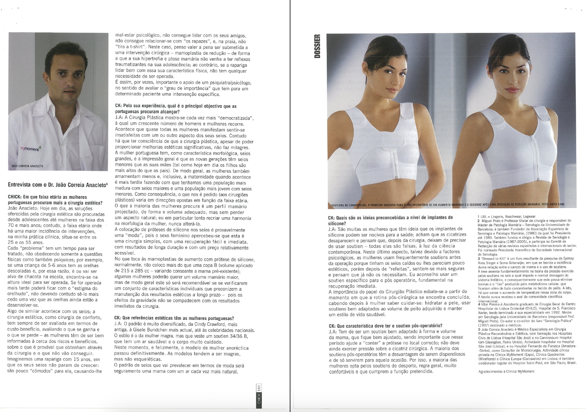 J.A: O padrão é muito diversificado, da Cindy Crawford, mais antiga, à Gisele Bundchen mais actual, até às celebridades nacionais. O estilo é o da mulher magra, mas que veste um soutien 34/36 B, que tem um ar saudável e o corpo muito cuidado. Neste momento, e felizmente, o modelo de mulher anoréctica passou definitivamente. As modelos tendem a ser magras, mas não esqueléticas. O padrão de seios que vai prevalecer em termos de moda será seguramente uma mama com um ar cada vez mais natural.