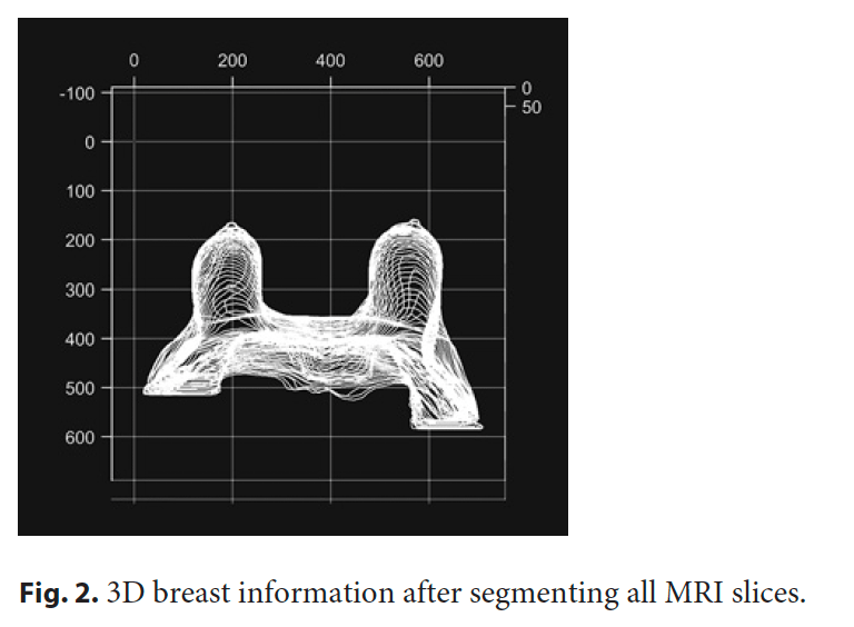 MRI with gadolinium contrast was performed according to institutional protocol, with the patient in the prone position with arms up; annotation, segmentation, and volume computation of the MRI tissue portions with T1 image sequences (Fig. 2) were performed