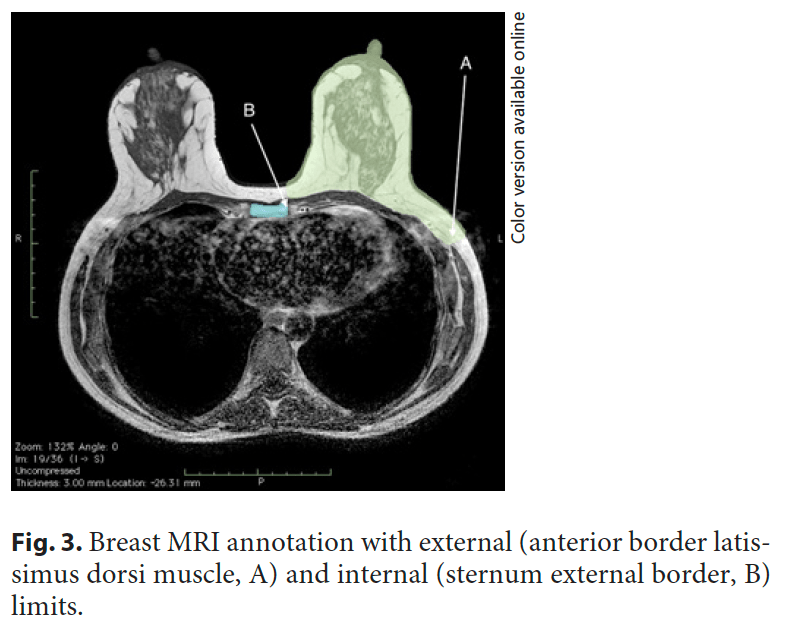 and validated by 2 radiologists using Horos R software v2.4.0 (breast contour, breast tissue, pectoralis major muscle, anterior border of the latissimus dorsi muscle as the breast external limit, sternum lateral border as the breast internal limit, and clavicle) (Fig. 3).