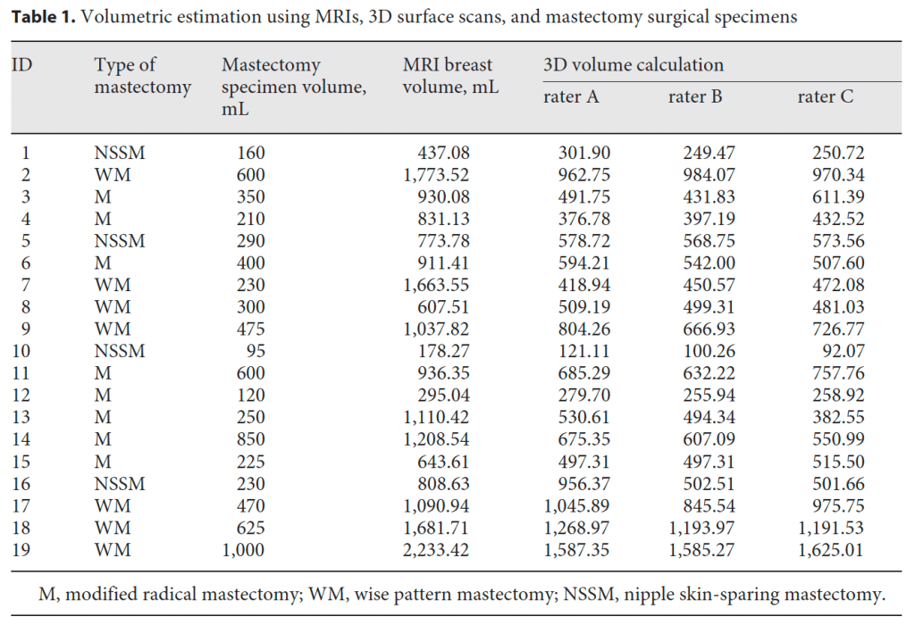 Estimating breast volume with different modalities has long been a research focus for improved breast cancer surgery planning, with breast MRI having been considered the gold standard [13]. However, since 3D surface scanning has become available, it is reported to be a valid method for estimating breast volume.