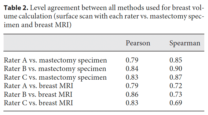 The level of agreement of the raters’ calculation of values from the surface scan, surgical specimen, and MRI annotation was also evaluated (Table 2). For mastectomy specimen volume, an average (SD) of 0.823 (0.027) and 0.875 (0.026) was obtained for the Pearson and Spearman correlations, respectively. Concerning MRI annotation, we obtained 0.828 (0.038) and 0.715 (0.018).