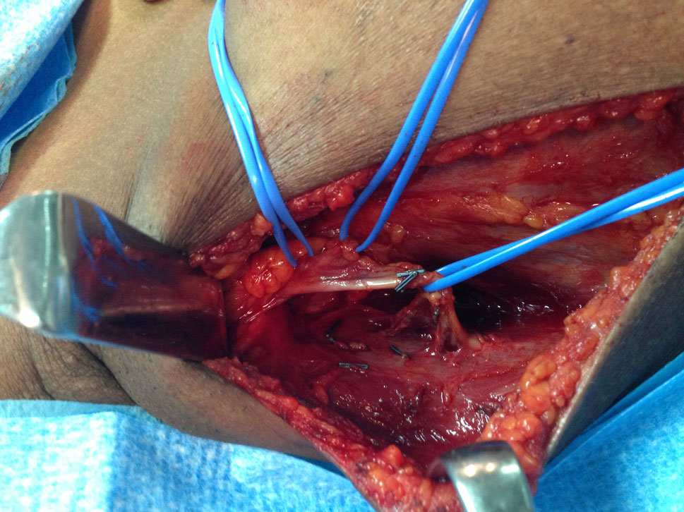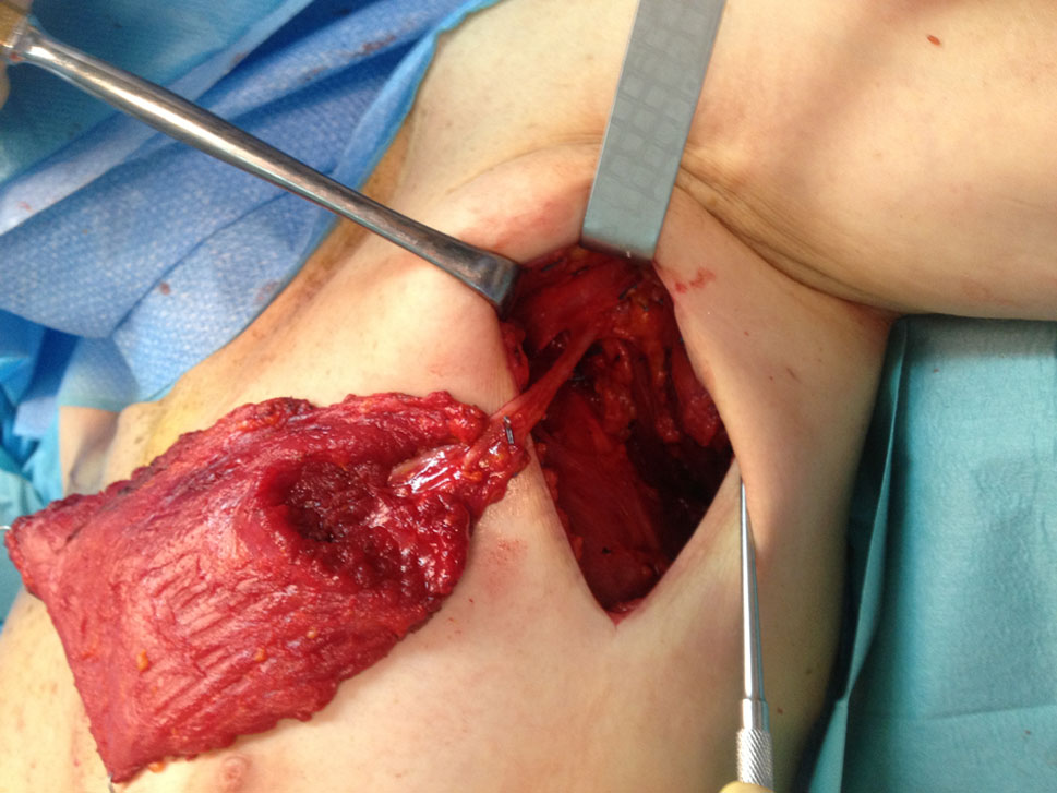 An axillary incision is used and initial dissection focuses on identifying the thoracodorsal axis. Once identified, minor vascular tributaries and the constant branch for the tip of the scapula are ligated and divided, to permit flap rotation; vascular dissection is carried out until the pedicle enters the muscle belly (Fig. 2).