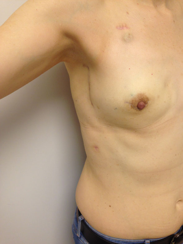 The distance to the lateral breast edge is then calculated and if necessary, further pedicle dissection is carried into the muscle, perforator style, or the serratus branch is ligated, permitting the LD muscle belly not to cross the lateral chest wall; then the upper muscle is again cut using electrocautery, and the muscle flap is transferred. We have used this new approach in 100 patients, with no significant complications, an irrelevant increase in operating time (around 15 min), and believe that this modification will improve lateral chest wall cosmesis (Figs. 3, 4) Studies will be needed to evaluate aesthetic results, and this will be our next step.