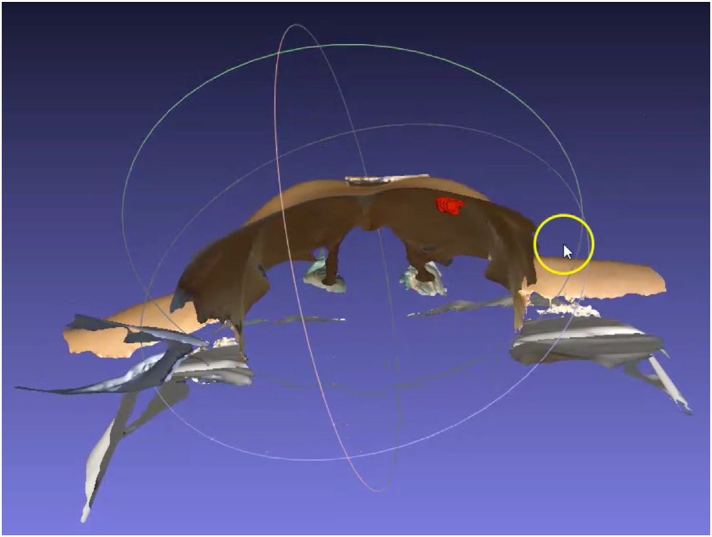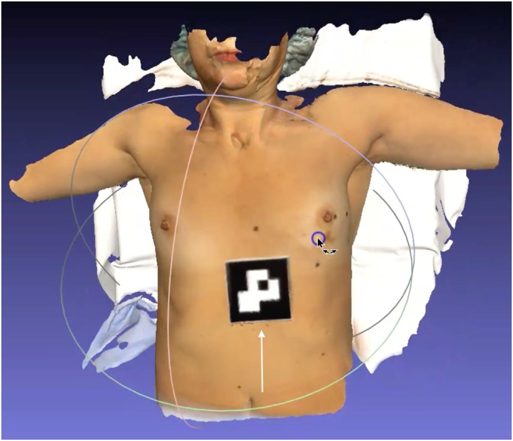 Breast MRI/3D scan fusion was accomplished with simple overlap between both modalities, including tumor, using BSM to perform spatial alignment between both modalities (Fig. 3). A patient-specific 3D digital breast model was processed and converted to a point cloud breast 3D model, referred hereafter as phantom model (Fig. 5), ready to be uploaded to an AR headset: Hololens 1.